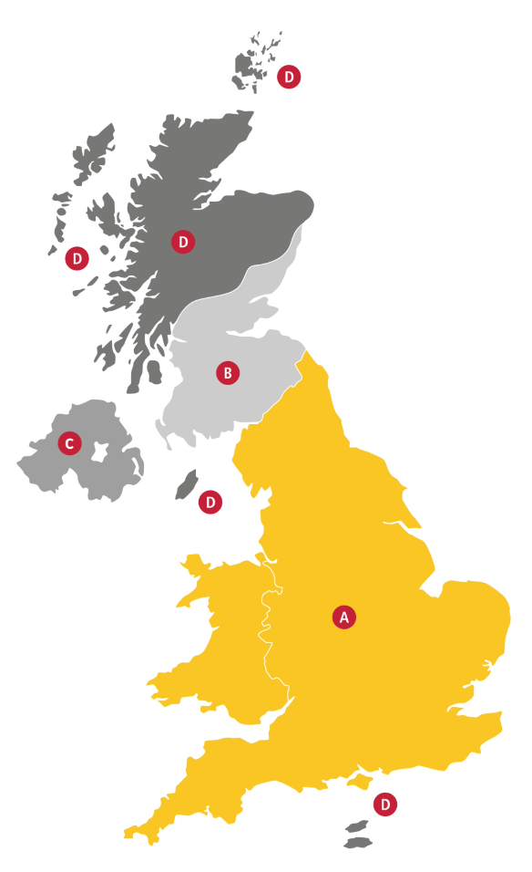 Postcodes: AB31-38, AB41-56, HS, IV, KA27-28, KW, PA21-50, PA60-78, PH4-44, PH49-50, ZE1-3